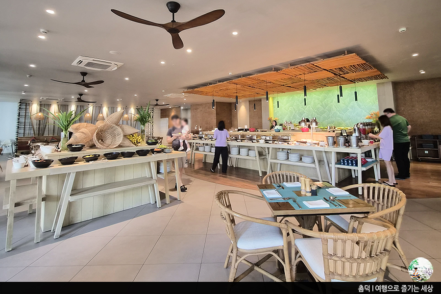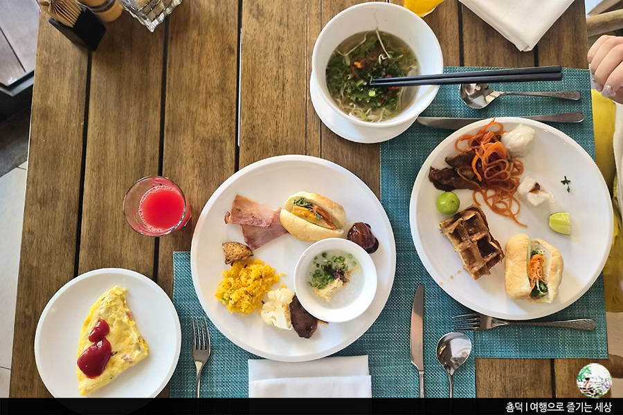 운동을 끝낸 후 리조트 레스토랑에서 조식을 먹습니다.