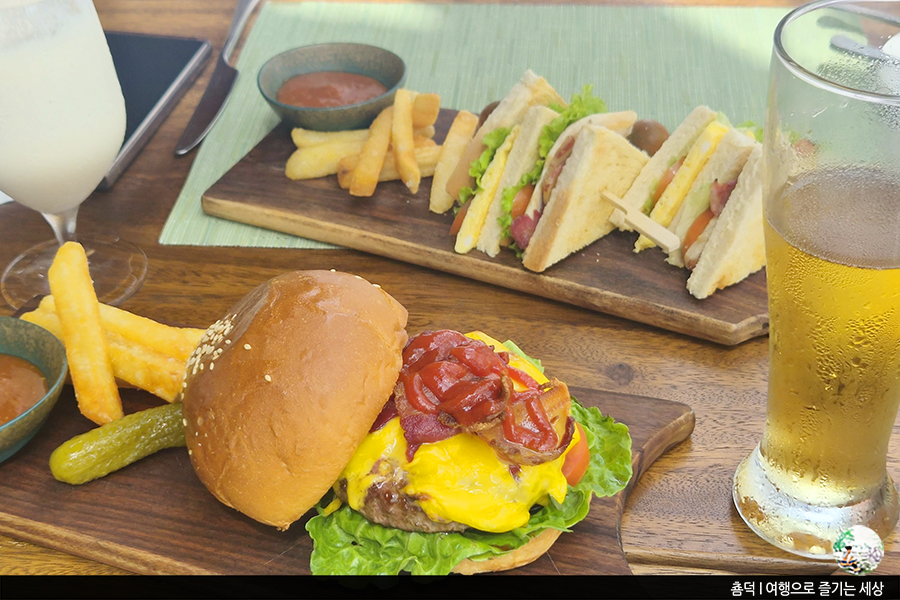 오전 내도록 물놀이를 하니 배가 고파졌어요. 오늘 점심은 보마리조트 나트랑 리조트에서 점심을 해결하기로 합니다. 이곳 햄버거가 그리 맛있다는 SNS평을 봤거든요. 수영장 선배드에 앉아 샌드위치와 햄버거, 그리고 시원한 맥주를 먹으며 점심의 여유를 즐겨봅니다.