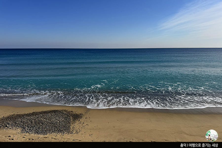 숙소를 내려와 숙소 주변을 걸어봅니다. 매번 느끼지만 영덕 바다, 정말 예쁩니다. '블루로드'라 불리는 이유가 있다니까요. 에메랄드 빛 바다를 보면 당장이라도 뛰어들고 싶은 생각이 들어요. 너무 예쁜 바다입니다.
