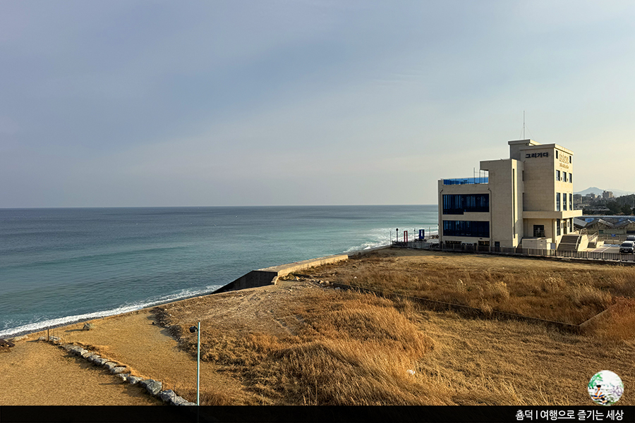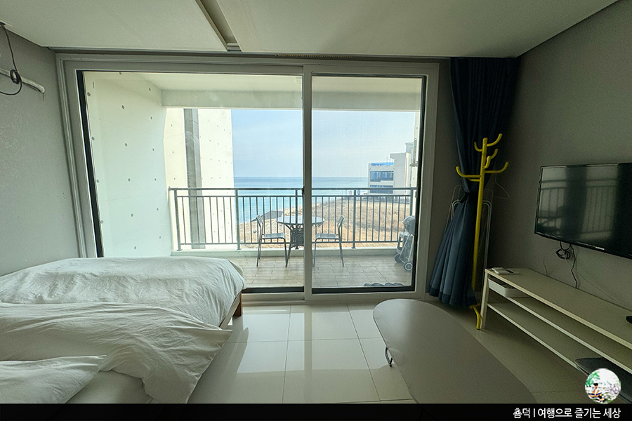 야외 테라스에서 예쁜 영덕 바다를 바라봅니다. 저희 객실은 아쉽게 바다가 정면에 보이는 객실은 아니었어요. 측면에서 동해가 보였지만, 그래도 이 정도면 나쁘지 않아요.