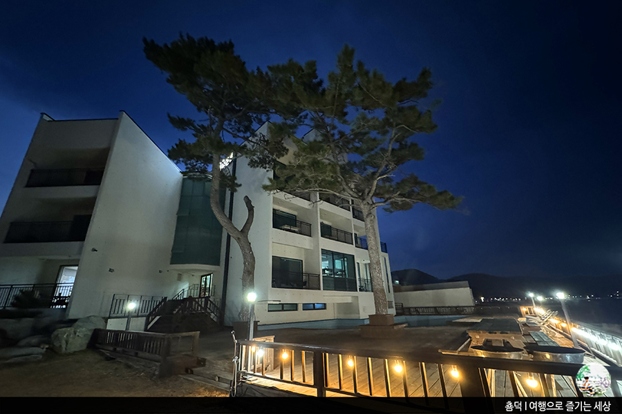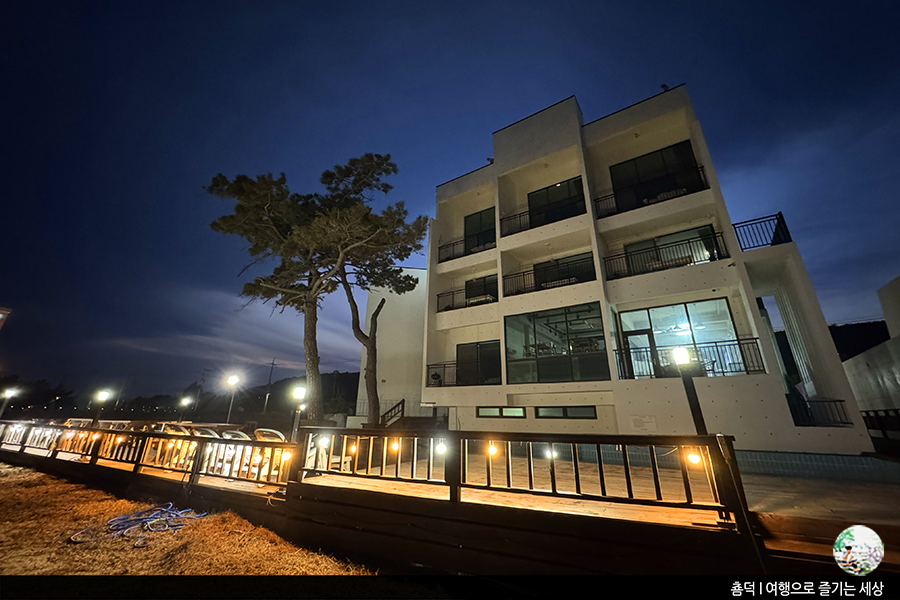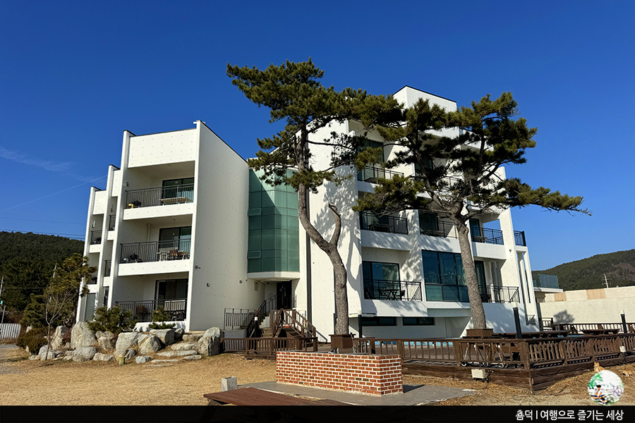 영덕 바다 바로 앞, 하얀 건물의 펜션이 멋지게 서 있어요. 늠름히 서 있는 소나무에다 야외 풀장이 펜션을 한 껏 멋지게 만들어 줍니다. 겨울 방문이라 야외 수영장 이용할 순 없었지만, 여름에 온다면 휴양지느낌이 물씬 날 것 같아요.