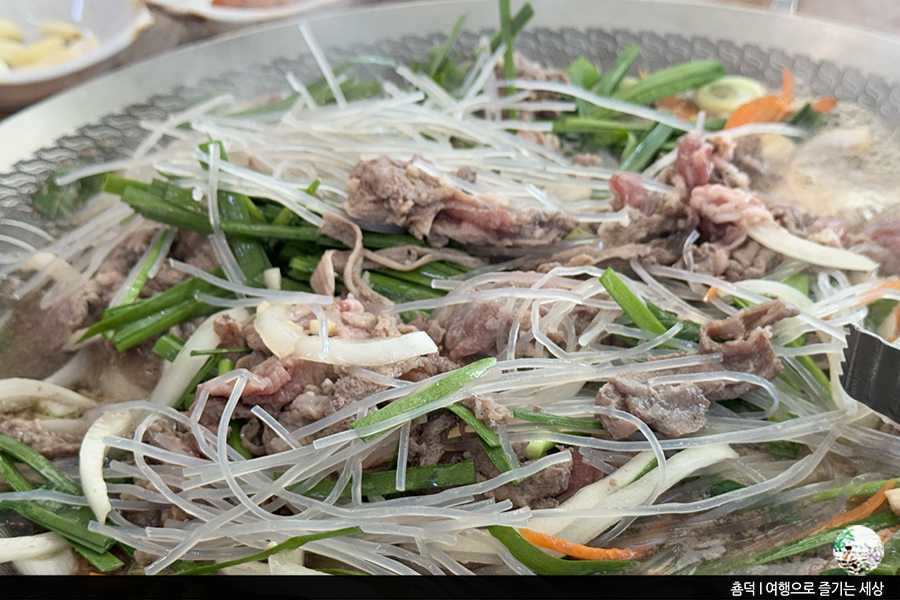 고기가 어느 정도 익으면 당면과 부추를 넣어 불고기의 풍미를 한 껏 곁들여 줍니다. 염소고기 누린내가 나지 않을까 걱정했는데, 냄새 전혀 나지 않더라고요. 불고기의 맛과 흡사해 먹기도 편했던 염소불고기입니다.