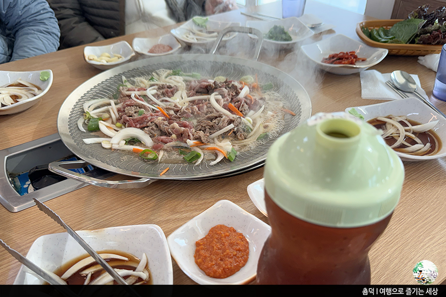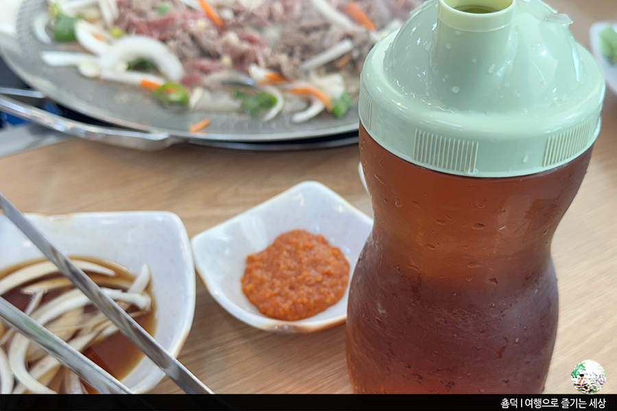 다 익은 불고기를 건져 준비된 양파장에 찍어먹어도 되고, 그냥 먹어도 되었어요. 아, 염소불고기에 공깃밥은 별도 구입이었어요. 어머님과 외할머니는 간이 맞다 하셨는데, 저는 불고기의 간이 조금 짜 밥과 함께 먹었어요.