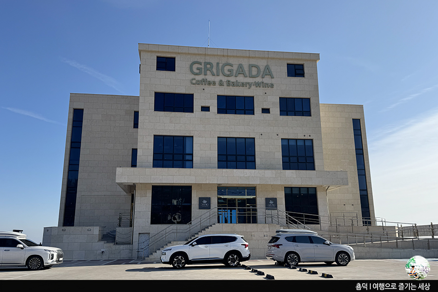 경북 영덕군 병곡면 흰돌로 102, 카페 그리가다는 영덕 고래불해수욕장에서 자동차로 3분도 채 걸리지 않는 대형 카페였어요. 영덕 바다를 마주하고 서 있는 카페인데, 대형카페답게 주차장 역시 넓더라고요.