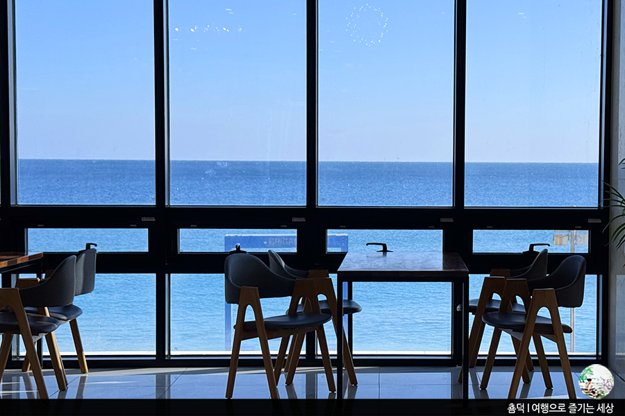카페 문을 열고 들어가니 넓은 창 너머 영덕의 푸른 바다 풍경이 눈앞에 한 껏 펼쳐졌어요. 창가에 나란히 나열된 테이블을 보니 누가 봐도 이곳이 제일 일기 많아 보이더라고요.