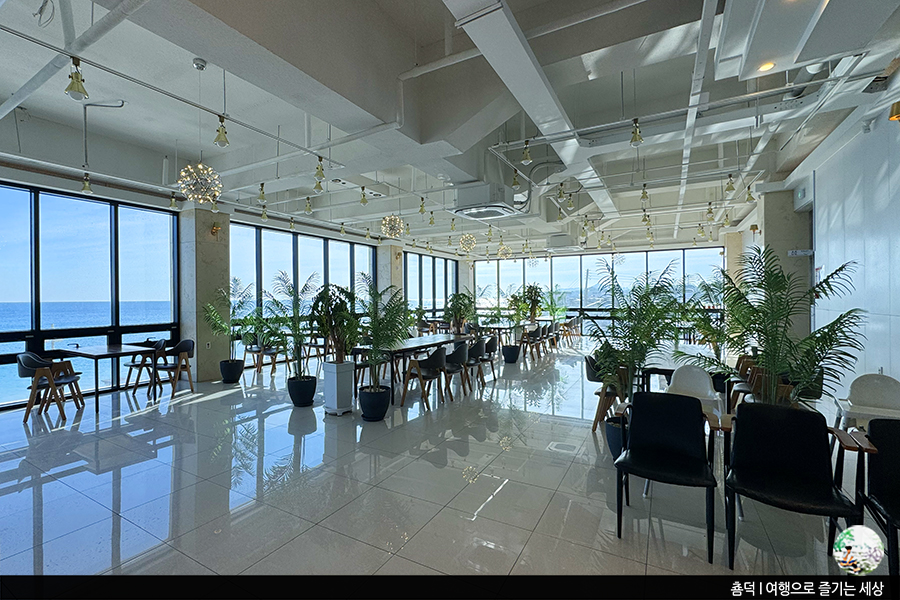 영덕 대형카페답게 층고가 높고 창이 커 어느 자리에 앉아도 시원한 바다를 감상할 수 있는 1층이었어요. 그리가다 카페는 2층도 있다는데, 저희는 올라가 보진 않았어요. 하지만 1층보다 더 멋진 파노라마뷰를 감상할 수 있다는 2층, 다음에 또 방문하면 2층에 가 봐야겠군요.