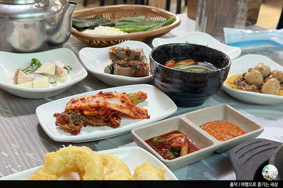 잠시 후 테이블을 한 가득 채운 상차림이 시작되었어요. 기본 반찬만 10여 개가 넘는 데다, 튀김, 수육, 생선구이에 돌솥밥까지 정말 상다리가 휘어질 정도의 상차림이에요. 지금은 임금님 밥상 부럽지 않습니다.