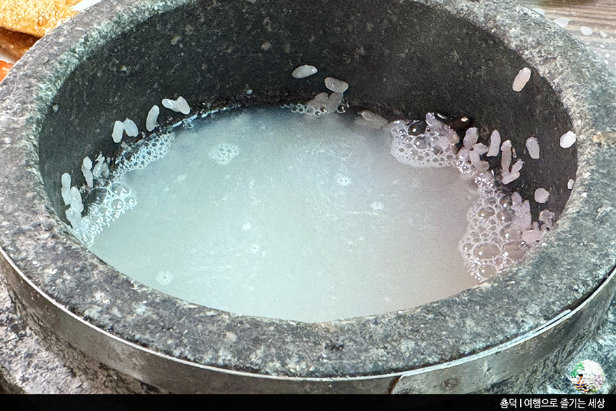 먼저, 김이 모락모락 피어 오르는 갓 지은 돌솥밥을 밥그릇으로 덜어냈어요. 돌솥밥의 묘미는 밥을 덜어낸 후 돌솥에 물을 부어둬야죠. 밥을 먹는 동안 숭늉을 만들어 마지막 마무리를 해줘야 하니까요.