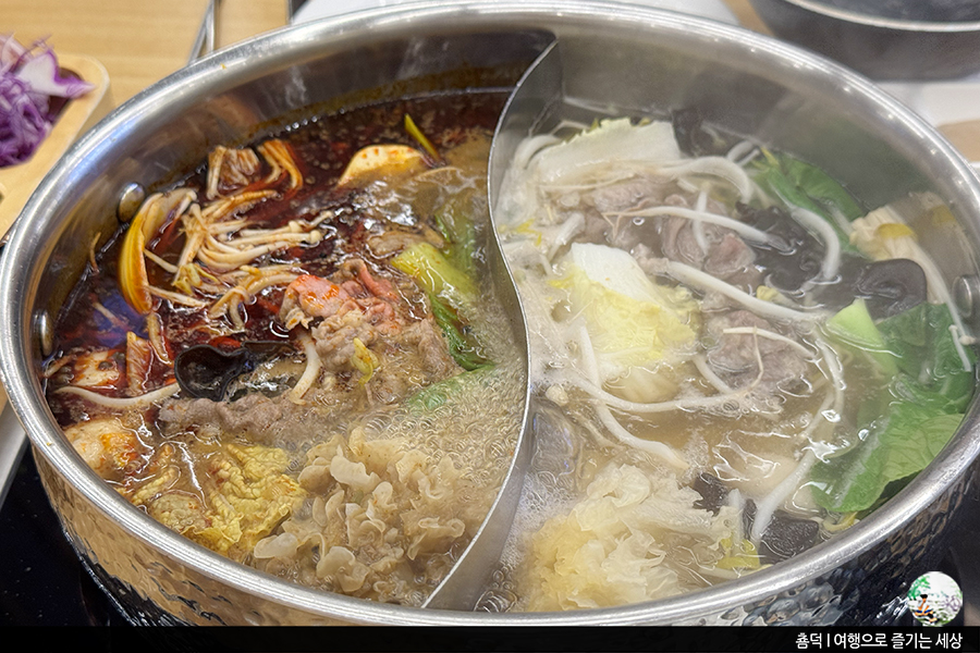 샤브올데이의 시그니처 육수인 양지와 마라소스로 반반 육수 선택했어요. 마라가 매콤함과 시원한 육수 둘 다 즐길 수 있어 인기 많은 듯!! 덕분에 몸이 따뜻해졌답니다.