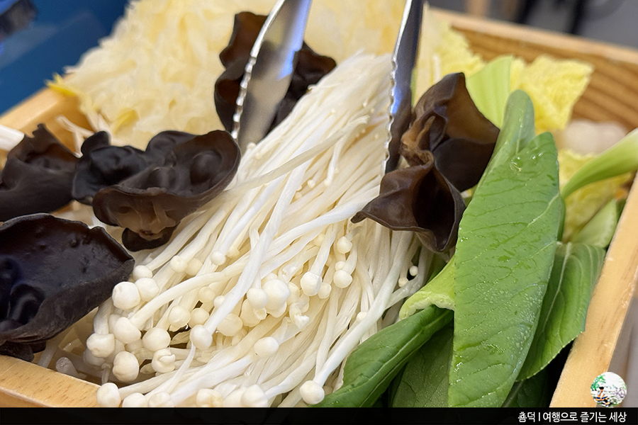 샤브집인 만큼 샤브 야채 빼 먹으면 안 되죠. 저는 샤브집 가면 주로 팽이버섯과, 목이버섯, 청경채, 배추를 메인으로 많이 넣어요. 시원한 국물과 야채가 잘 어울리거든요. 손님이 많아서 그런지 회전율이 빨라 싱싱한 채소를 가져올 수 있었어요.